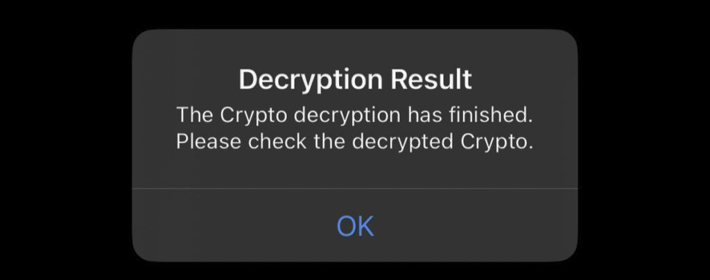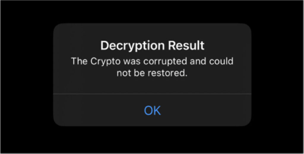 In this case, a message will appear saying “The Crypto was damaged and could not be restored.”